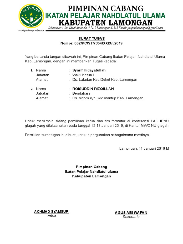 Contoh Surat Tugas Ipnu - Contoh Surat Tugas Ipnu Ippnu Contoh Surat / Umumnya, surat tugas tersebut dikhususkan untuk para guru yang akan bertugas di bagi anda yang sedang mencari contoh surat tugas guru, maka harus memahaminya terlebih dahulu.. Dalam memahami kegiatan surat menyurat khususnya surat tugas, anda perlu mengetahui contoh surat tugas yang baik dan benar. Jendral a yani no.08 jakarta timur telp. Peran ikatan pelajar nahdhatul ulama ikatan pelajar putri. Penjelasan lengkap seputar contoh surat tugas yang baik dan benar. Surat tugas biasanya akan dikeluarkan ketika ada salah satu karyawan dari perusahaan, lembaga pemerintahan atau instansi yang lainnya untuk menugaskan pekerjaan diluar.